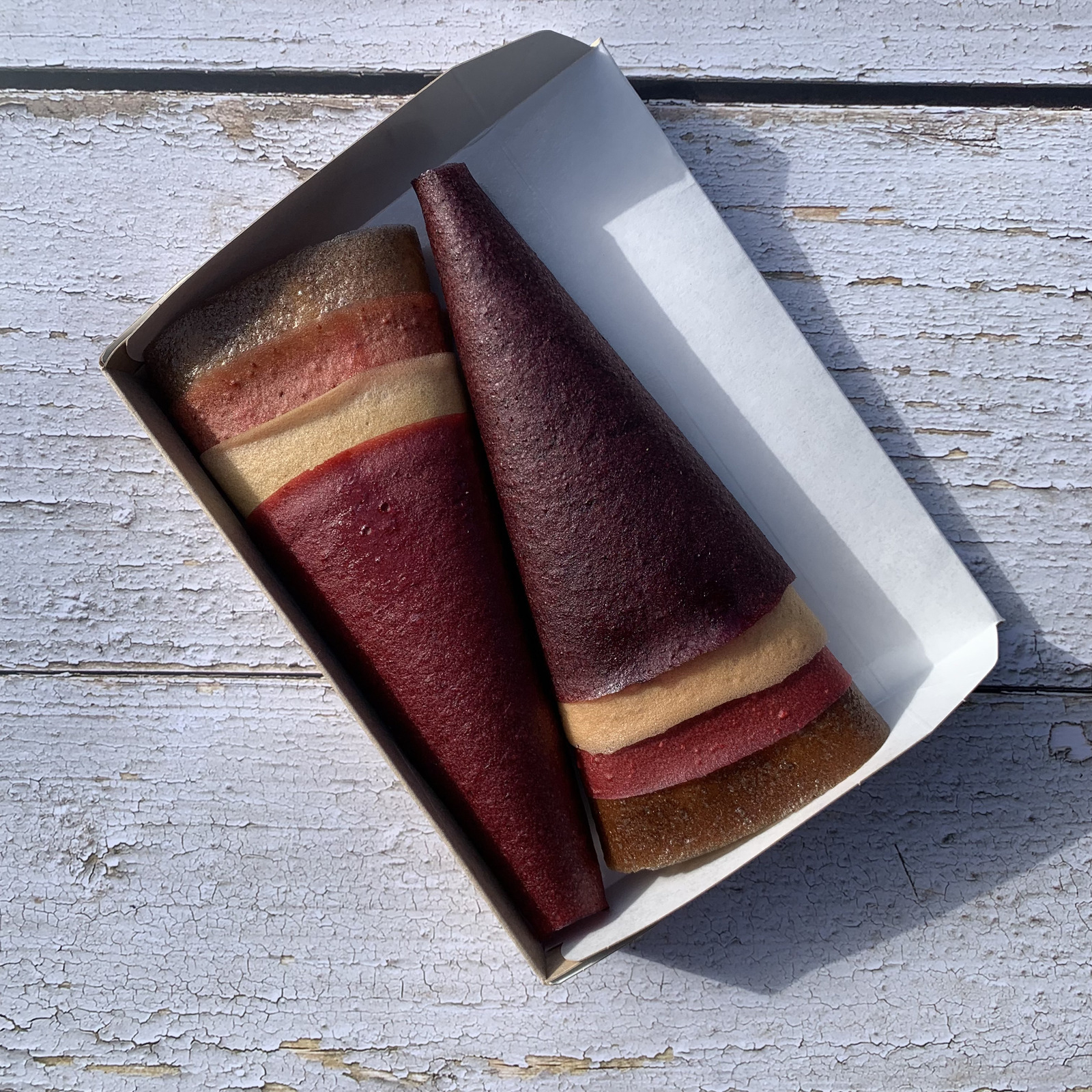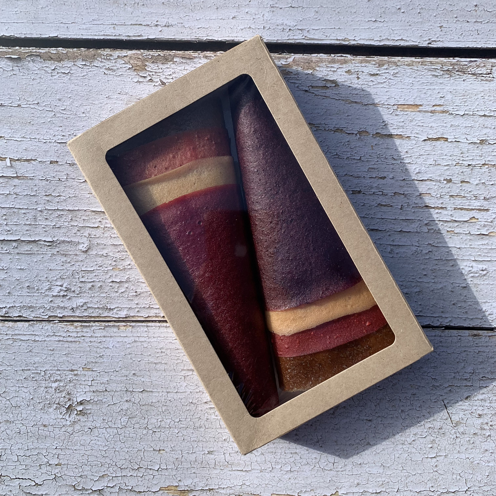 Acest discovery box conține 8 clătite din fructe 100% naturale, realizate prin deshidratare cu aer cald, metodă care păstrează o mare parte din nutrienții naturali ai fructului. Fiecare clătită conține un singur tip de aromă, pentru a permite identificarea clară a preferințelor.